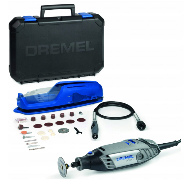 Dremel 3000 to dynamiczne narzędzie wielofunkcyjne o szerokim zakresie zastosowań. Jest idealne do cięcia, rzeźbienia, ścierania, wiercenia, polerowania, frezowania, ostrzenia i szlifowania. Narzędzie wyposażone jest w silnik o mocy 130 W, co pozwala na wykonanie niemal każdego zadania DIY wymagającego precyzji. Sterowanie prędkością obrotową zapewnia maksimum precyzji i osiąga zakres od 10 000 do 33 000 obr./min, a miękki uchwyt redukuje poziom drgań, zapobiega zmęczeniu oraz zapewnia stabilny chwyt.